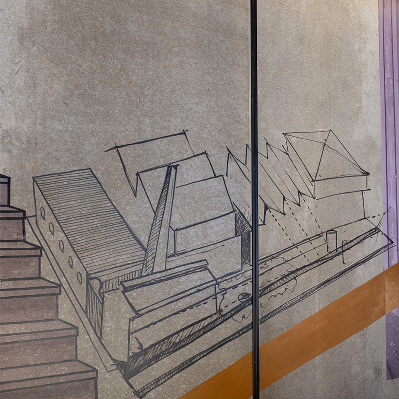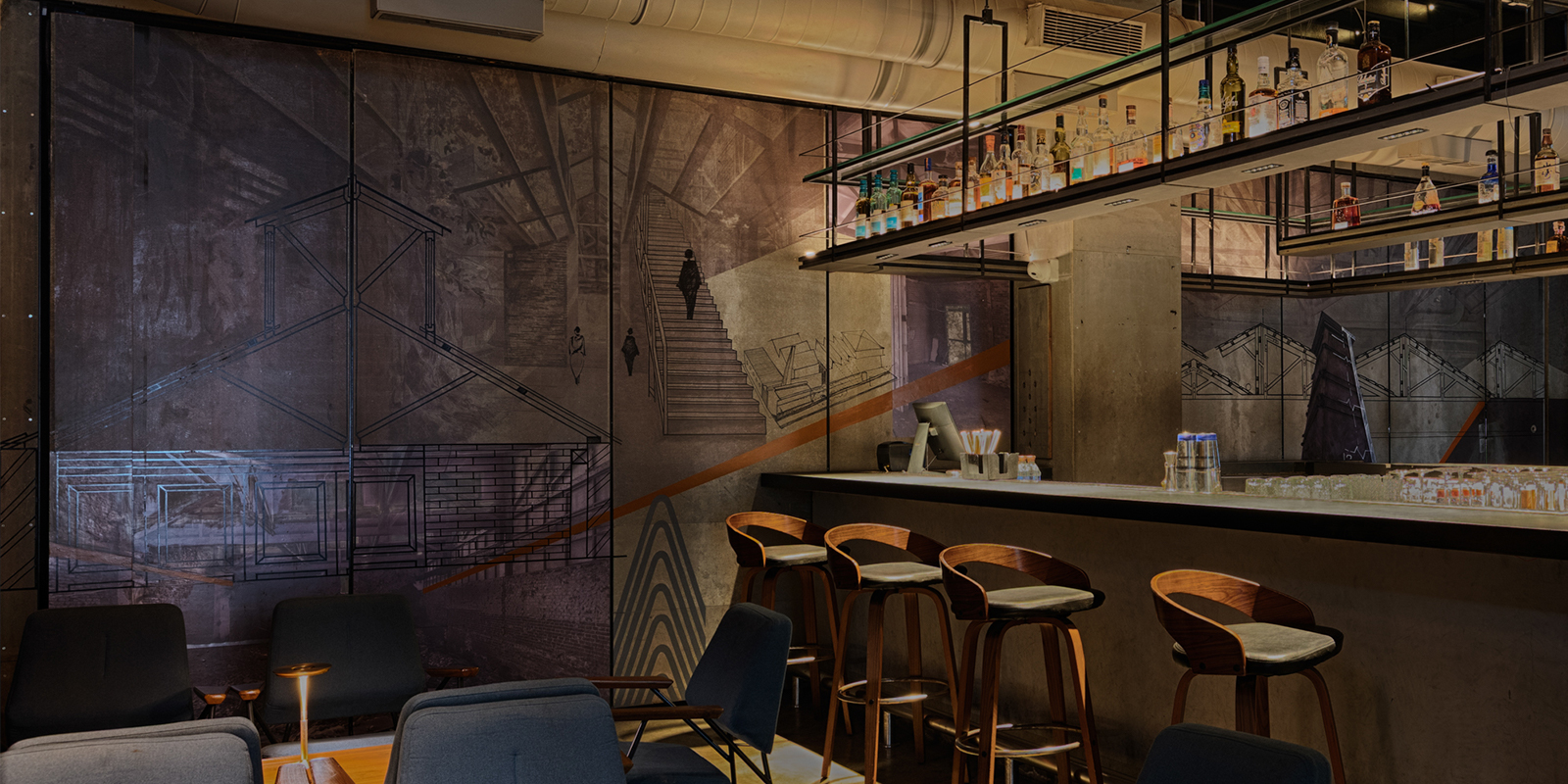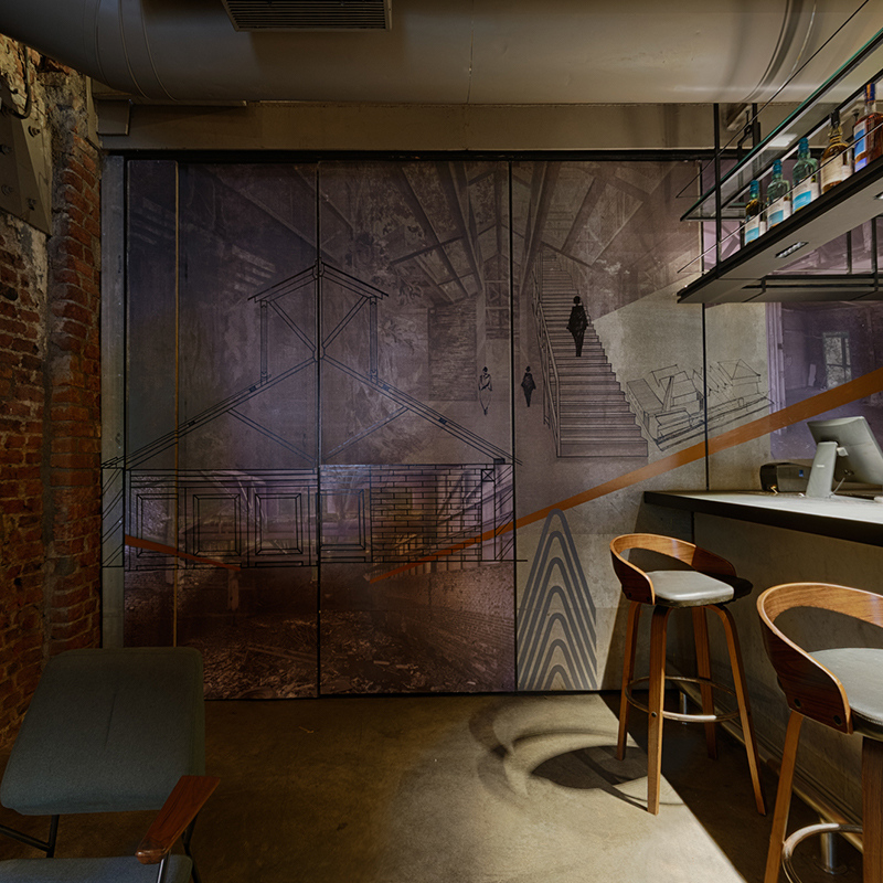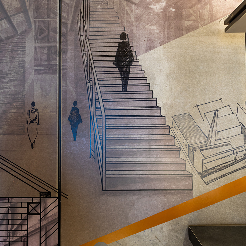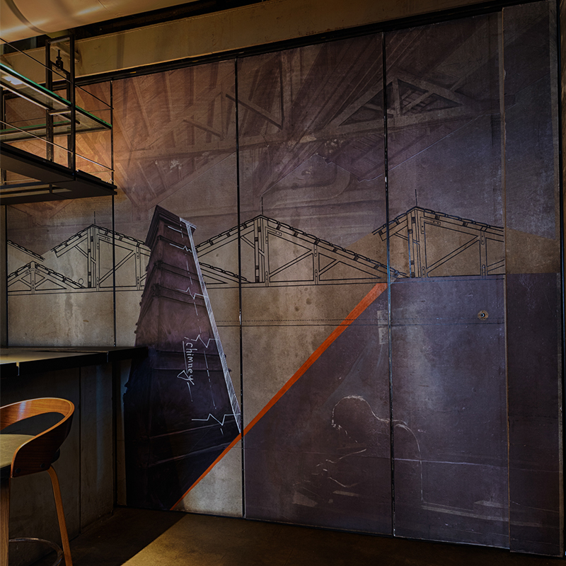 Our custom wallpaper design for them hence, became a tribute and a visual link between their past and present. We used features from the ancient architecture, such as the eye-catching roof structure, the industrial chimney, and the staircase that is an ode building’s previous existence.
